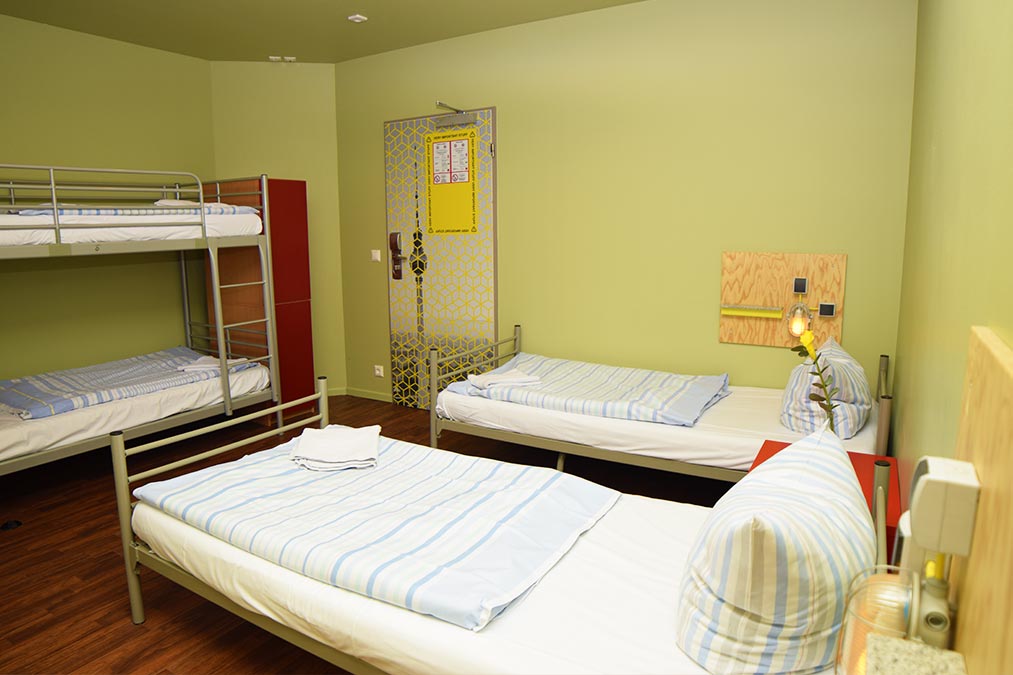De 4-persoons kamer bestaat uit twee eenpersoonsbedden en een stapelbed, kledingkast, bureau met stoelen, grote spiegel en een eigen badkamer. Deze grote en comfortabele privé‐kamer biedt alles voor je perfecte verblijf in Berlijn. Hier de feiten op een rij: