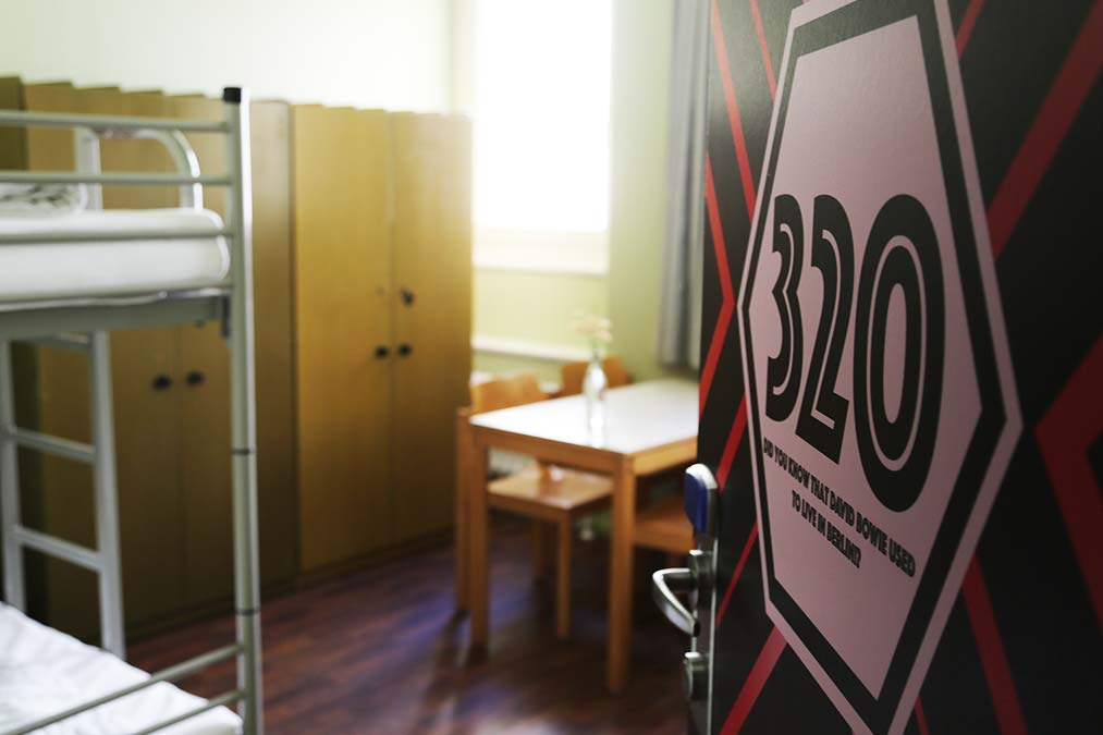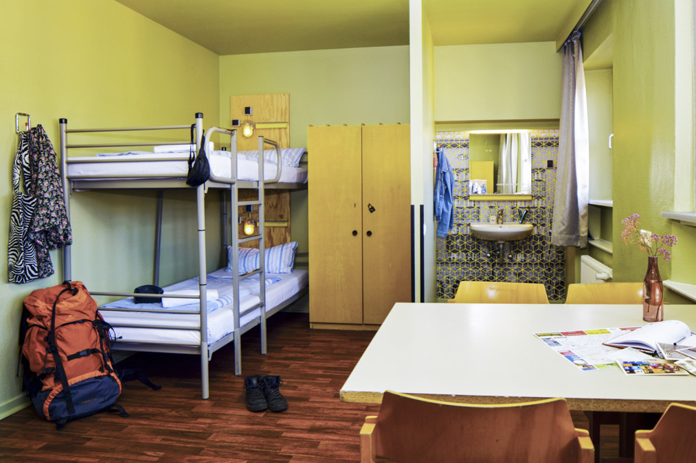 Наши четырехместные номера с удобствами на этаже обставлены двумя двухъярусными кроватями, шкафами, письменным столом и стульями, раковиной и зеркалом. Это отличный выбор по выгодной цене для тех, кто ишет удобный многоместный номер для себя и друзей. Итак, список мебели в номере: